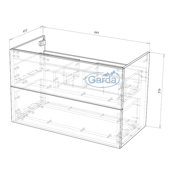| Конструкция | В собранном виде: — фасады с интегрированной ручкой — 2 выдвижных ящика, направляющие скрытого монтажа с доводчиком, в верхнем ящике предусмотрен вырез под сифон |