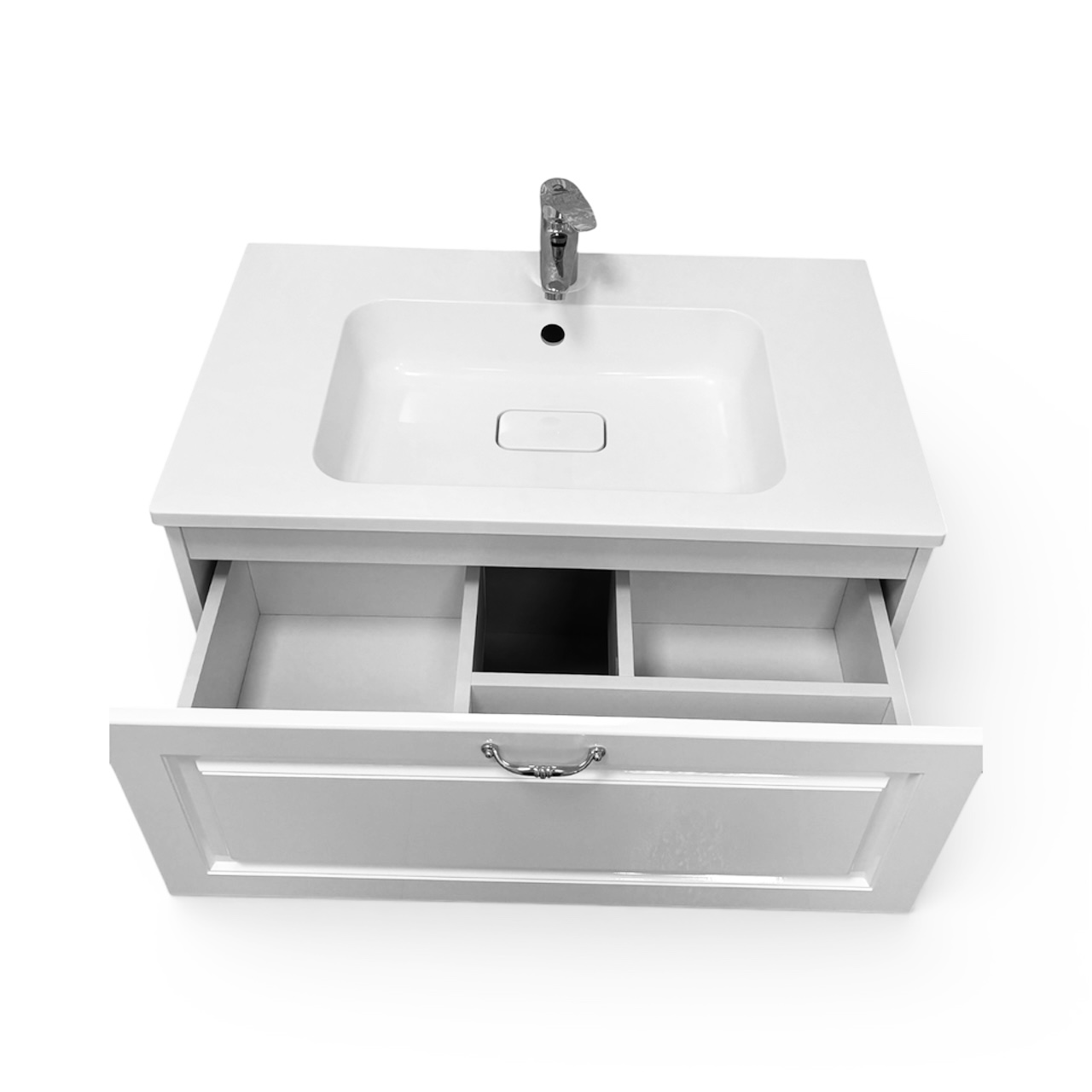 -в верхнем ящике предусмотрен вырез под сифон и предусмотрено три удобных отделения для хранения,