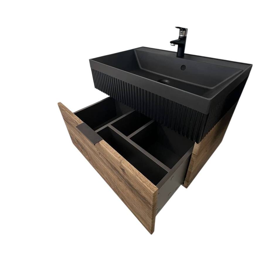 В собранном виде: 1 выдвижной ящик с тремя удобными вместительными отделениями, направляющие скрытого монтажа с доводчиком, в ящике предусмотрен вырез под сифон |
